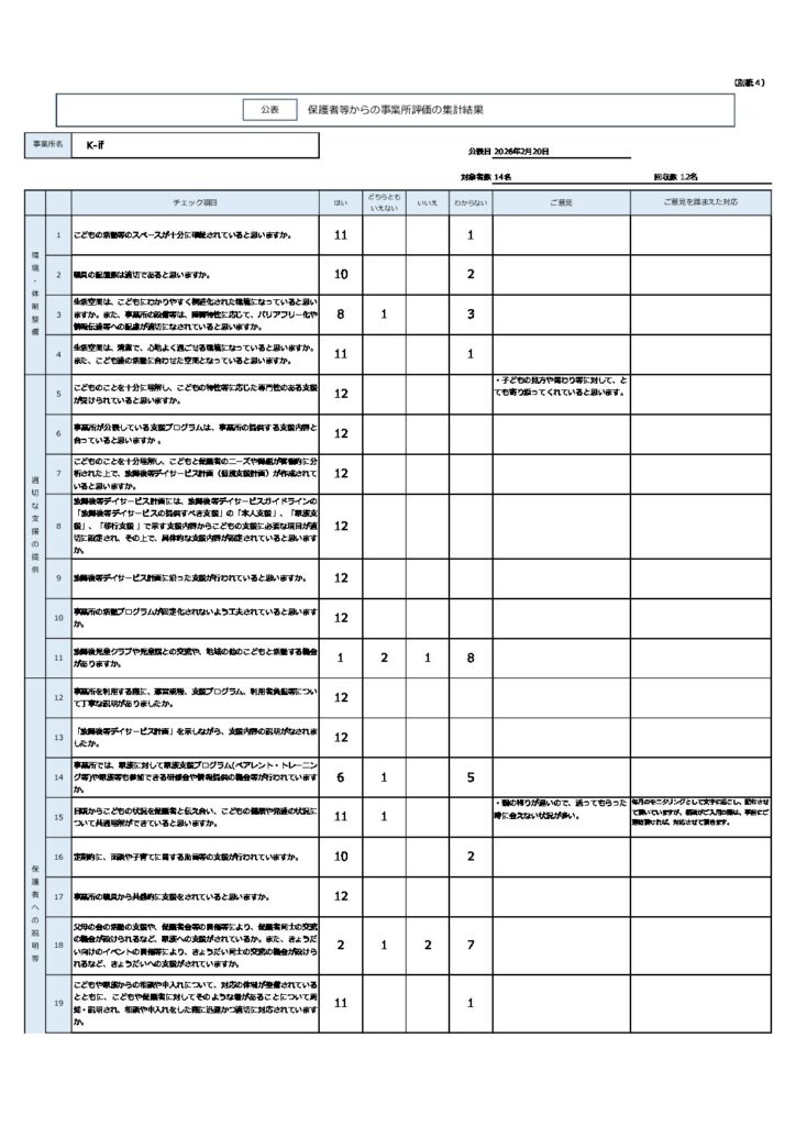 お知らせ 保護者等からの事業所評価の集計結果 2026.02.20 令和7年度障害児通所支援事業に係る自己評価において、保護者の皆さまに事業所の評価を行っていただきましたので、集計結果を公表いたします。 行動援護従事者養成研修開講のお知らせ 前の記事 事業所における自己評価結果 次の記事