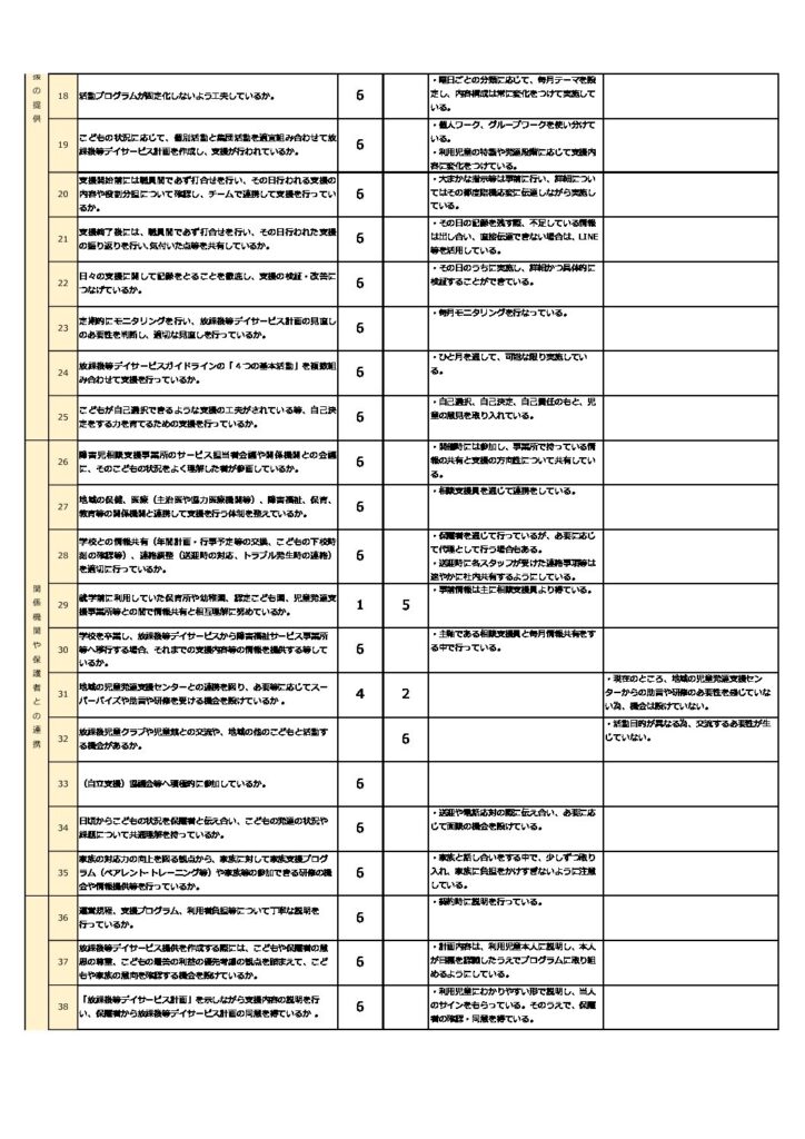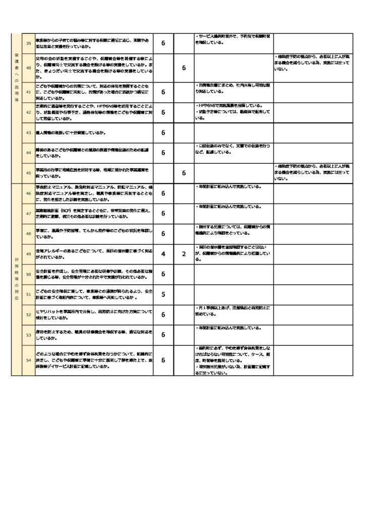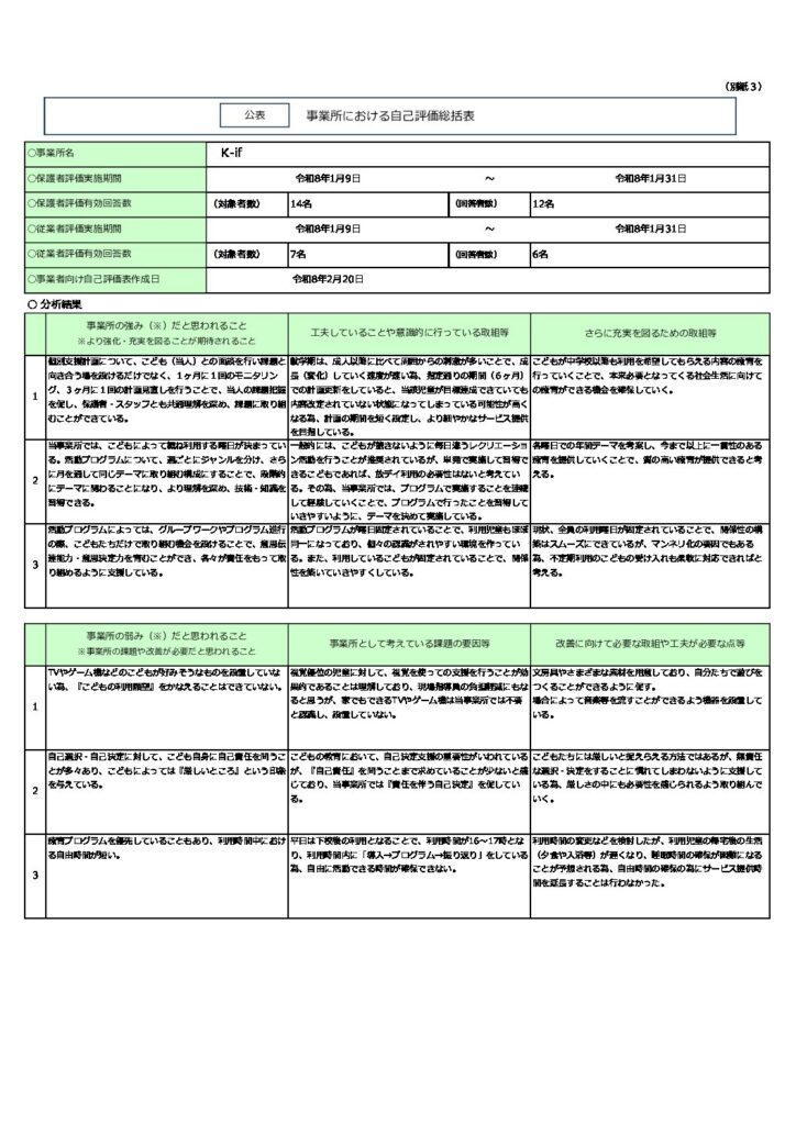 お知らせ 事業所における自己評価結果 2026.02.20 令和7年度障害児通所支援事業に係る自己評価において、事業所における自己評価結果を公表いたします。 保護者等からの事業所評価の集計結果 前の記事